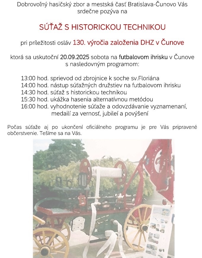 Dňa 20.09.2025 (sobota) sa uskutoční súťažou s historickou hasičskou technikou pri príležitosti osláv 130. výročia založenia DHZ Čunovo, ktorá sa bude konať na futbalovom ihrisku v Čunove.